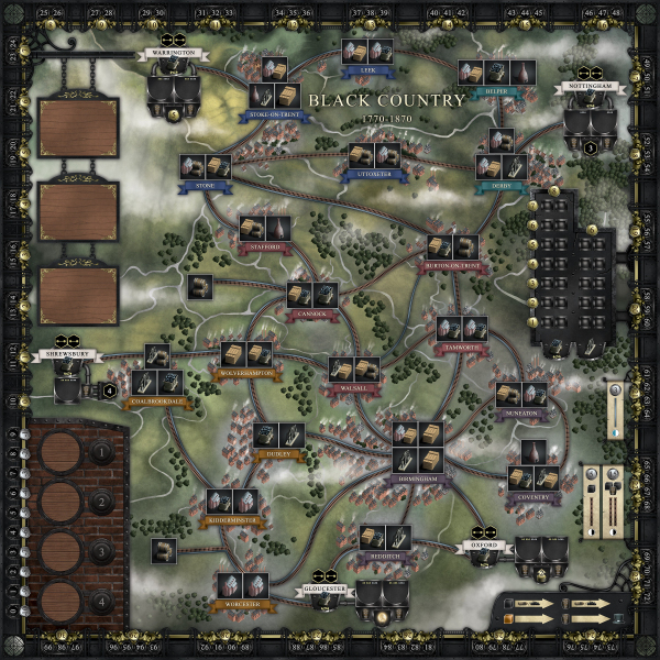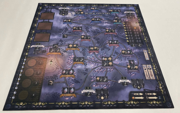 Printed on both sides, with a rubber core and stitched edging. This Brass Birmingham play mat will make your game night a hit! Our artist hit it out of the park with this beautiful creation to add theme, and organization to your Brass game night.