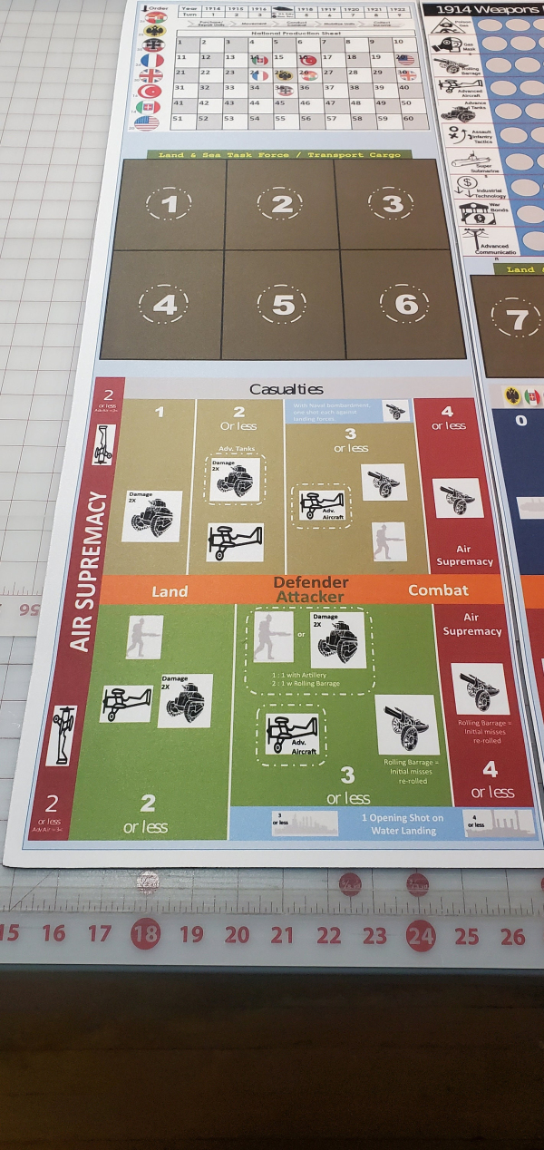 1914 – 36" x 36" For playing the World War One version of Axis & Allies. Custom rules for R&D tracks included: https://axisandallies.fandom.com/wiki/Axis_%26_Allies_1914_Research_%26_Development