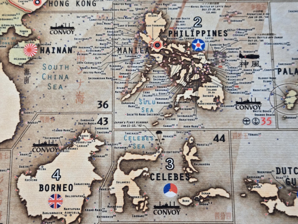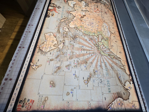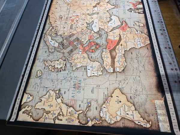 Lt. Dan's work of art captures that "old world" feel where national insignias, symbols and propaganda posters of that time period were added to the map providing an immersive gameplay experience for the famous WWII game, Axis & Allies, Global 1940 by Wizards of the Coast. Lt. Dan spent countless months and years documenting historical information that includes numerous land and sea battles, casualties inflicted, final resting places of 800+ warships during naval battles, locations of 5400+ supply ships sunk by submarines, famous operations, amphibious and airborne assaults, along with so many other details scattered throughout the map for one to enjoy while playing the game.